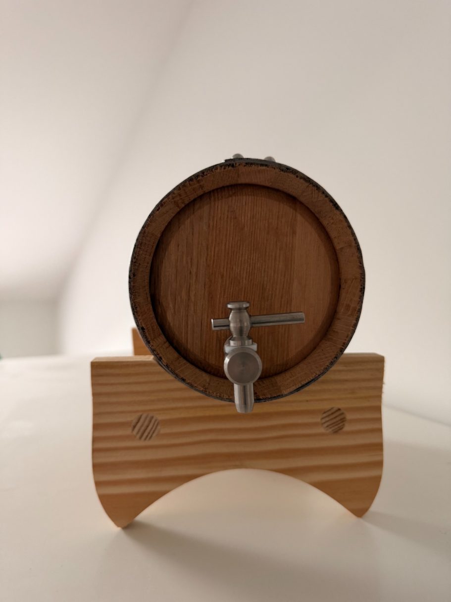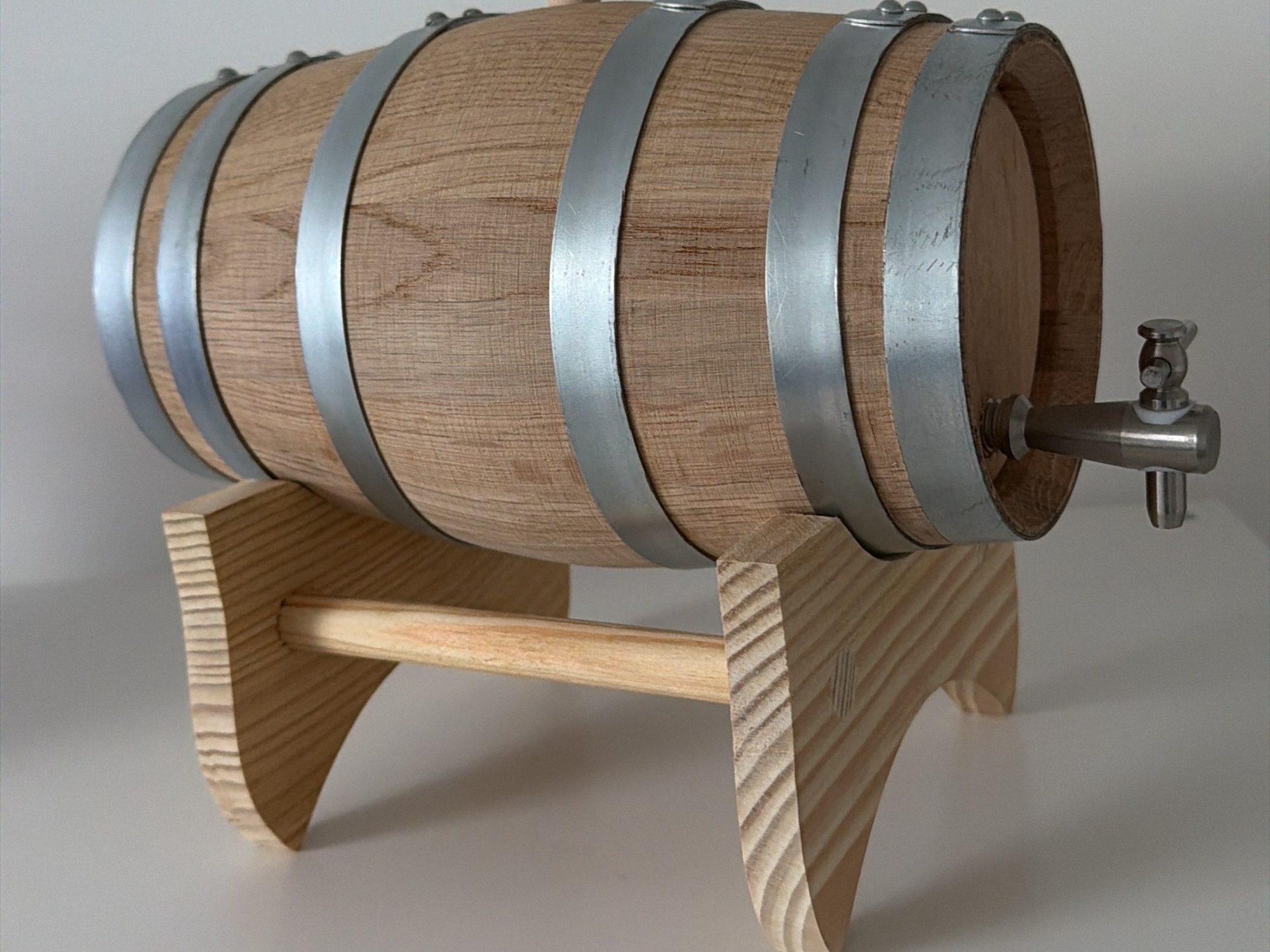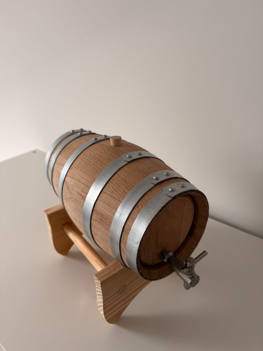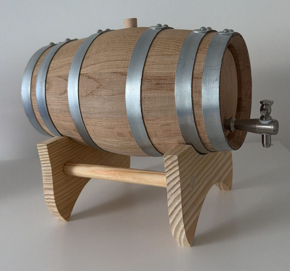Barriles de roble con soporte de madera y grifo de acero inox.